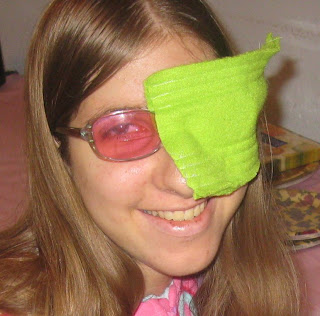 Here is a picture of me with my eye patch on. I made it. Here is a picture of me when I was little and me now.